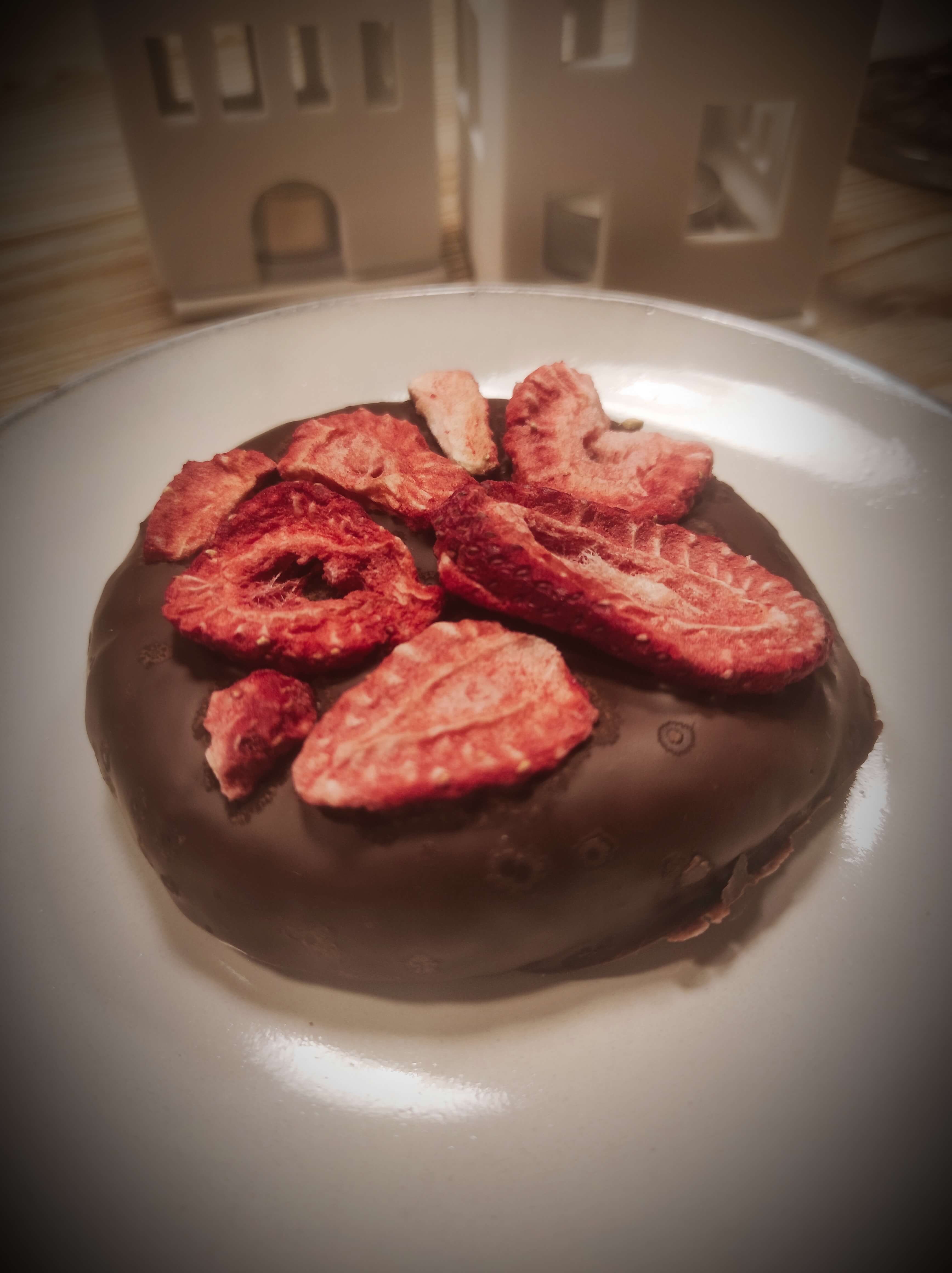 Mit Zartbitterschokolade glasiert und gefriergetrockneten Erdbeeren belegt.