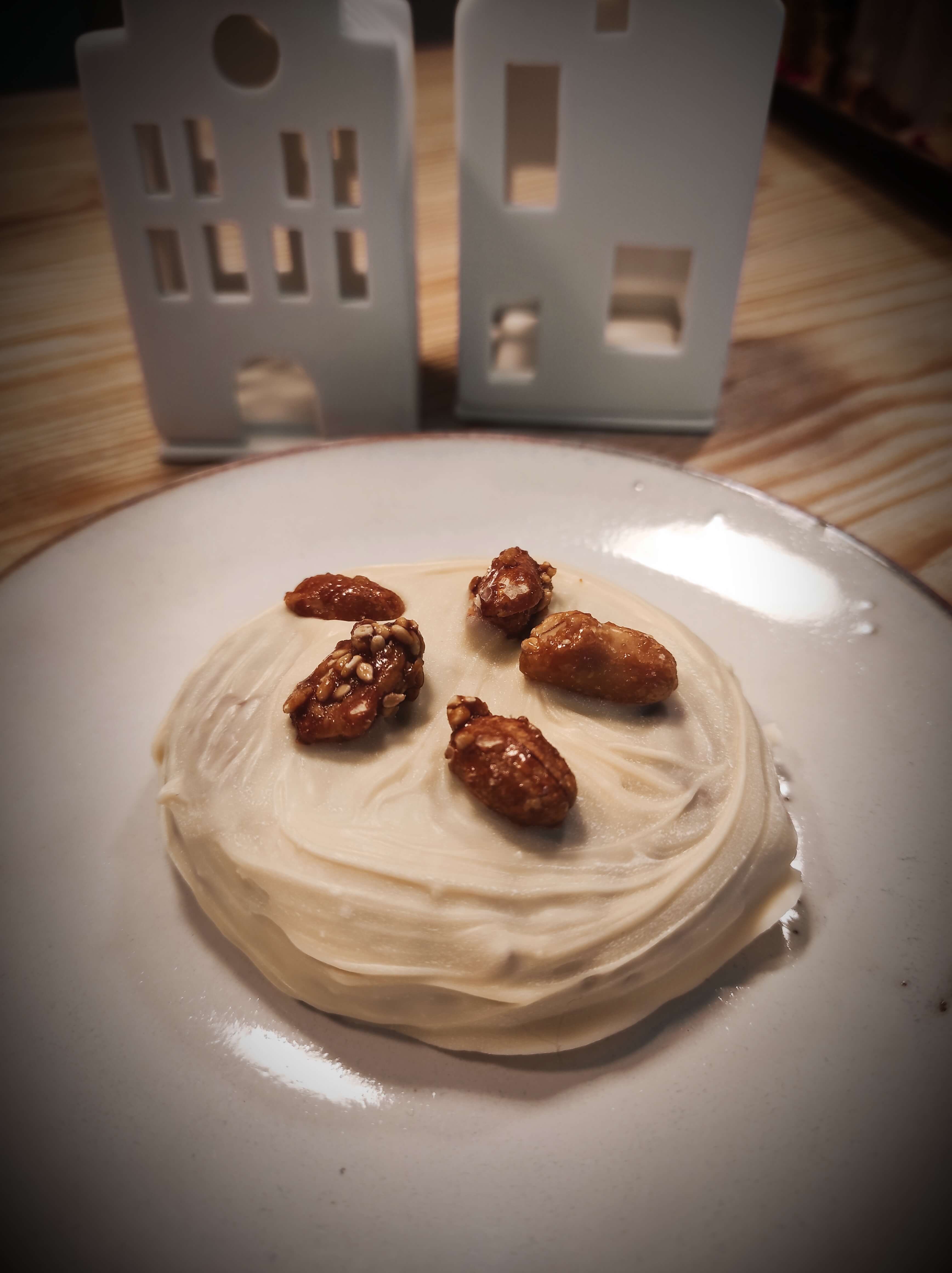 Mit weißer Schokolade glasiert und Haselnusskrokant.